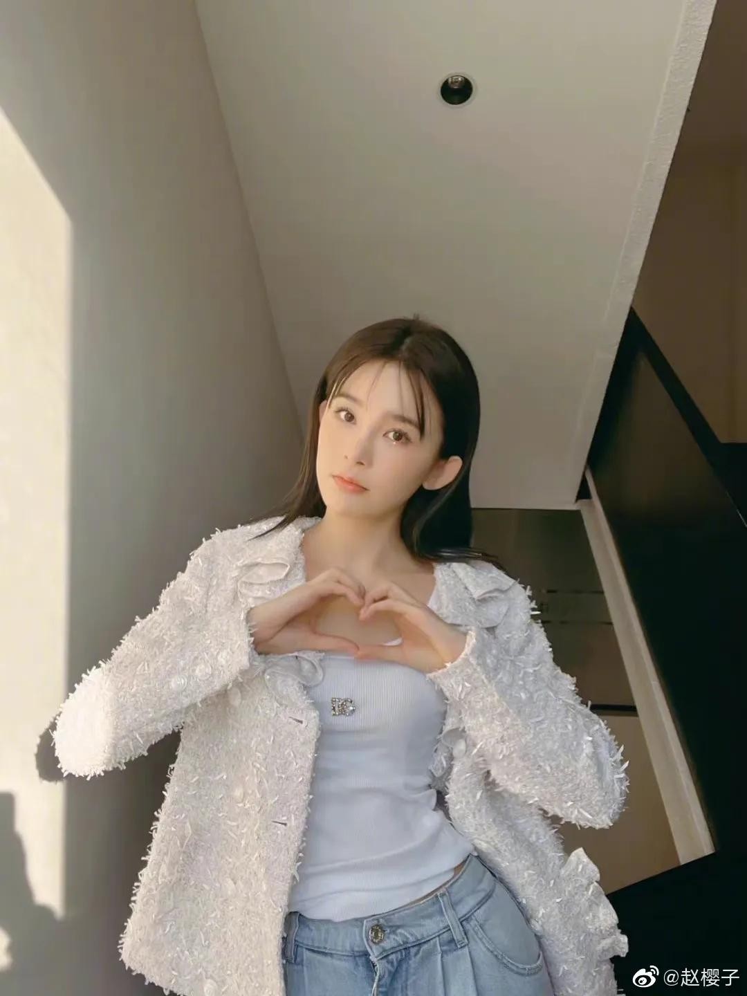其中还有一张照片,赵樱子穿着白色外套,双手比着爱心,看起来心情不错。
