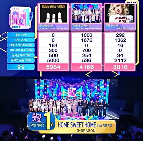 这个周末好消息再一发! GD宣传期零打歌,还是在昨天播出的SBS电视台音乐放送节目《人气歌谣》中,以新歌〈HOME SWEET HOME〉打败后辈ROSÉ、女团TWICE,惊喜拿下一位宝座,这也是他睽违7年再度人歌夺冠。