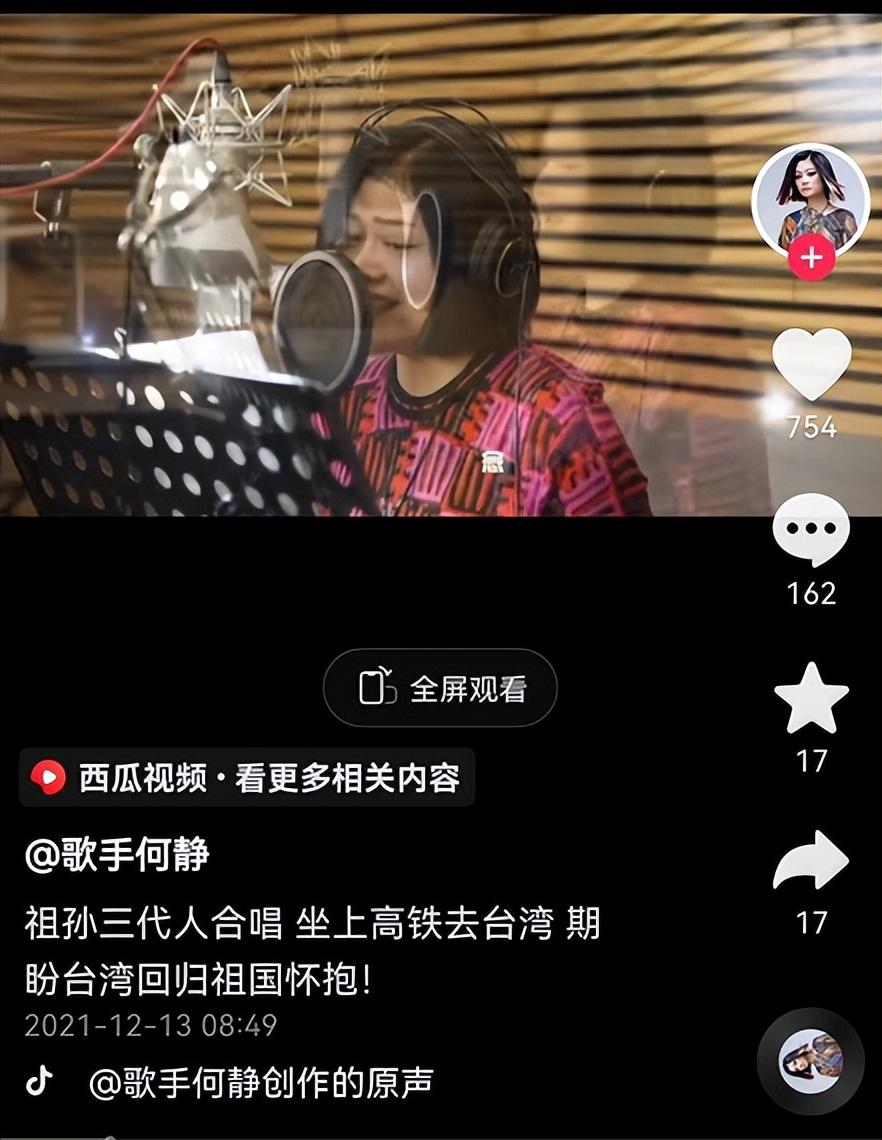 事实上,这不是何静第一次和女儿同框,去年12月13日她还和女儿合唱《坐上高铁去台湾》,并配文“祖孙三代人合唱《坐上高铁去台湾》,期盼台湾回归祖国怀抱。”