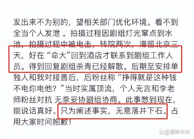 替身称拍摄中因电击住院三天," 命大 " 回到剧组后被告知已杀青解散,之后安排了专人对接善后。对于自己被电击,李易峰的粉丝称 " 挣的就是这种钱,不电你电他?",碍于顶流身份,个人无力对抗,就憋屈到现在,并强调此时说出来只是阐述事实,并不是落井下石。