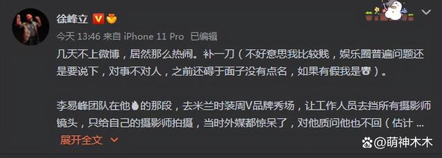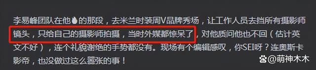 他称李易峰团队在火的时期,去米兰时装周看秀,让工作人员挡住所有摄影师镜头,只给自己的摄影师拍摄,当时就惊呆了一众外媒。对外媒的质问也不回应,猜测可能英文不好,全程连个礼貌谢绝的手势都没有。在现场,有个编辑直接感叹 " 你 SEI 呀,连奥斯卡影帝也没做过这么嚣张的事儿 "。