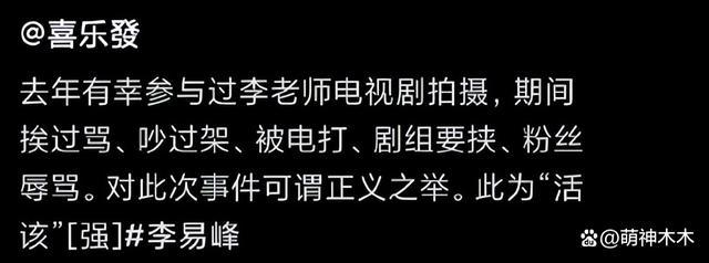 此外,还有当过李易峰替身的网友站出来 " 倒油 ",诉说自己的委屈。他称自己有幸参与过李老师的电视剧拍摄,期间挨过骂、吵过架、被电打、剧组要挟、粉丝辱骂,对李易峰此次事件的评价是 " 正义之举 ",认为 " 活该 "。