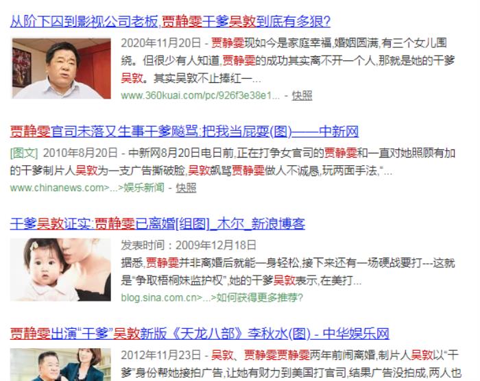 可是,好景不长,这对昔日的亲密“父女”也翻脸了。当时贾静雯向干爹哭诉,她为了和前夫打官司,需要交纳高额的诉讼费,手头有点紧张,干爹随后就帮她接了一支广告,当时贾静雯说:“可以呀,你做主!”,可是,吴敦这边谈妥了,贾静雯却反悔了,去接了别人的广告,把吴敦夹到中间非常难堪。