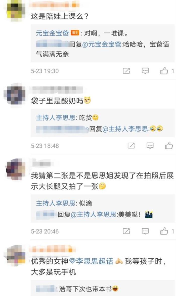 有很多网友看到李思思的照片后留言道“这是陪娃上网课么”,她老公回应道“对啊,一堆课”。还有网友评论道“优秀的女神,我等孩子时大多都是玩手机”。