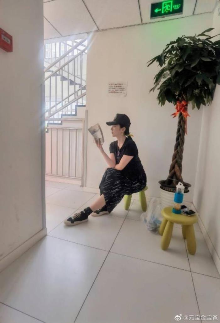 从图片中可以看出李思思身穿黑色短袖,下身身穿黑色带有条纹的半身裙,戴着鸭舌帽,脚踩帆布鞋,打扮的非常年轻,这个角度也是李思思的老公偷拍的,李思思坐在小板凳上,一双大长腿非常抢镜,她还拿着一本书看,什么时候也不忘记学习,状态很好。