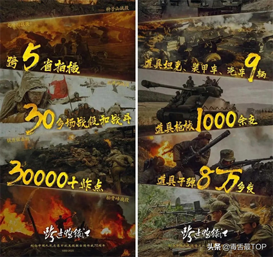 为了真实再现这段艰苦卓绝的史诗篇章,剧组在开拍前便已完成了130多万字的资料梳理和考证。拍摄全程共有400多个历史场景、320多个有名字的角色、500多人的美术置景团队,仅拍摄5场战役就打出了8万发子弹,其体量之大可见一斑。