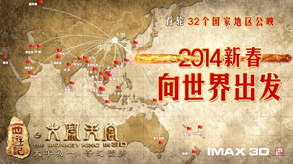 随后,除亚洲为主的首轮32个国家和地区外,《大闹天宫》于14年3月至8月陆续在美国、加拿大、日本、印度、西欧、东欧、中北美洲、南美洲、非洲近50个国家公映,全球票房节节攀升。