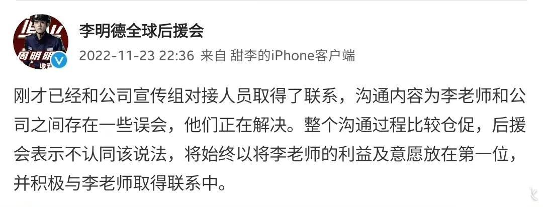 后来李明德粉丝后援会从公司处得到的说法是:李明德与公司的沟通之间存在一些误会,但还是很积极地在和李明德取得联系。