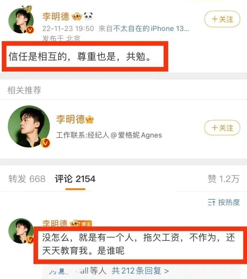 11月23日,演员李明德发文:信任是相互的,尊重也是。随后李明德又在评论区留言称,没怎么,就是有一个人拖欠工资,还天天教育我。是谁呢?