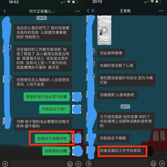 在聊天截图中,李明德一直在质问“王老板”自己的工资情况,但对方的语气和态度一直都不好,还强调“你拿后面的工作开玩笑吗?”,疑似是在威胁李明德。