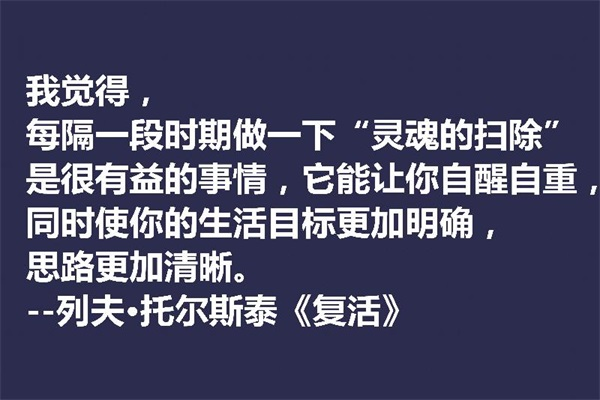 我觉得,每隔一段时期做一下“灵魂的扫除”是很有益的事情,它能让你自醒自重,同时使你的生活目标更加明确,思路更加清晰。——列夫·托尔斯泰《复活》