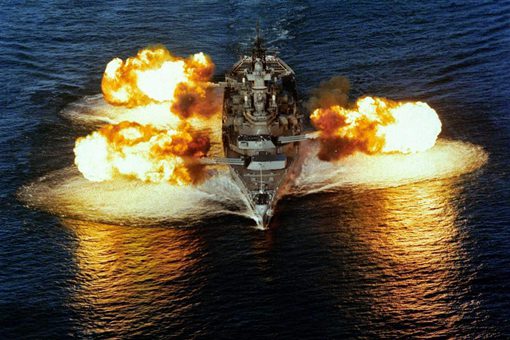 “依阿华”号战列舰9门主炮右舷顺次射击,据称可导致这艘排水量45000吨的庞然大物侧移10米。