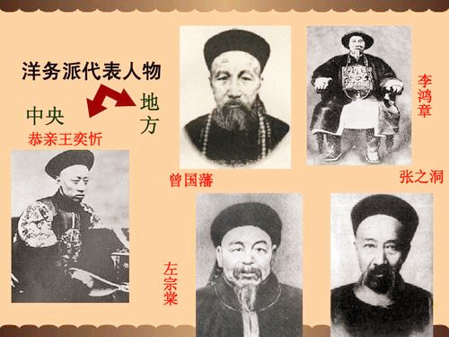 洋务派以“师夷长技以自强”为主要宗旨,以“中学为体、西学为用”为原则,在中央的主要代表是以恭亲王奕訢、瓜尔佳·文祥为代表的满族宗亲贵族官员,在地方是以曾国藩、李鸿章、左宗棠、张之洞为代表的汉族官员。