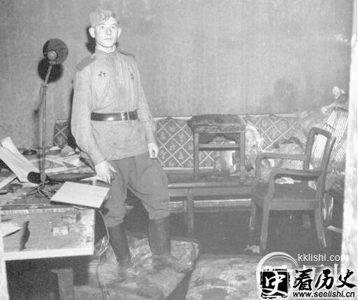 二战期间,经过盟军的轰炸,希特勒在帝国总理府下面用来藏身的地堡几乎成为废墟。1945年4月30日,希特勒和布劳恩在那里结束了他们的生命。图为希特勒就坐在照片中的沙发上开枪自杀,上面还有血迹。