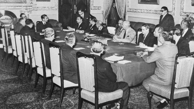 甚至要巴印联防对抗中苏,当时美国代表匆匆奔走于印巴之间, 强令双方举行部长级会议来解决克什米尔问题。