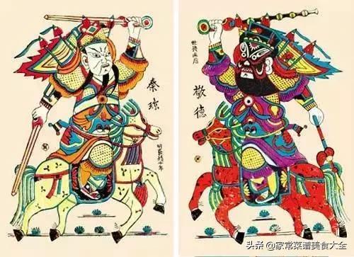 除了神荼和郁垒,民间信奉的门神还有唐朝的武将秦叔宝和尉迟恭。相传,唐太宗有段时间半夜经常听到门外鬼魅呼号,彻夜无法安睡,于是就让这两位武艺超强的武将手持兵器立在门的两边镇守,第二天夜里,就再也没有鬼魅骚扰了。