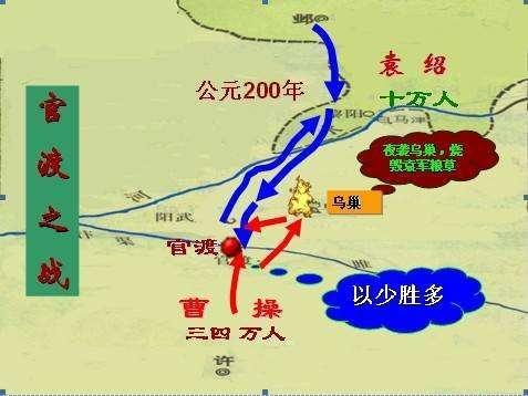 曹操纳其言,派兵袭烧袁军粮车;又亲率精锐5000奔袭袁军乌巢(今河南境)粮屯,全歼袁军,烧毁全部囤粮。消息传来,袁绍所部军心动摇,纷纷溃散投降。