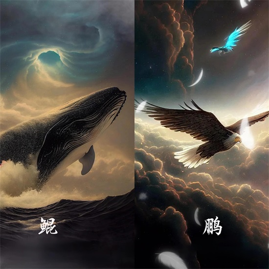 北冥有鱼,其名为鲲,鲲之大,不知其几千里也。化而为鸟,其名为鹏,鹏之背,不知其几千里也。