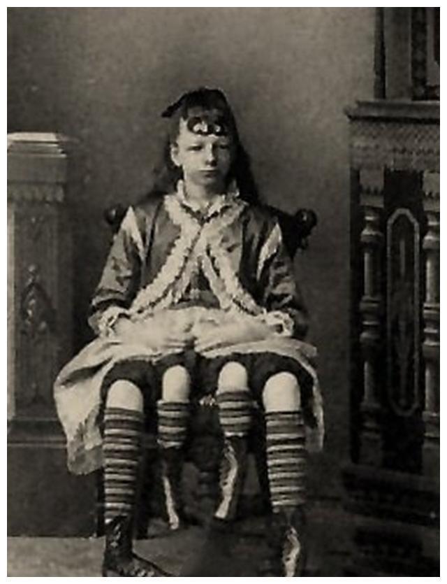 图中的JosephineMyrtleCorbin在1868年的时候出身在田纳西州的林肯镇。她生出来的时候就是双臀畸形,也就是说她腰部下来两边分别有一个独立的骨盆。