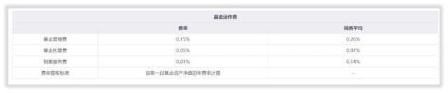 与同行相比较低,行业平均基金管理费率0.26%,基金托管费率0.07%,销售服务费率0.14%。