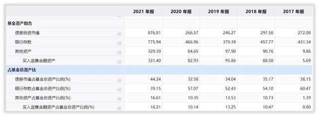 2017年至2022年上半年,基金降低银行存款的投资占比,从60.47%下降至44.94%;买入反售金融资产占比提升,从0.80%提高至19.01%,基金流动性要求大幅上升。