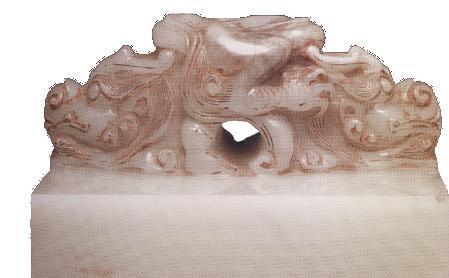 这枚“如来大宝法王之印”边长12.8厘米、高8.3厘米,现藏于西藏博物馆。此印为白玉琢造,双龙钮,印文字体为九叠篆体,刻有“如来大宝法王之印”八字。其玉质洁白,晶莹细腻,雕刻的双龙栩栩如生,为玉印之精品。
