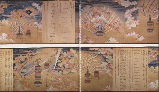 《普度明太祖长卷图》则记录了得银协巴在南京灵谷寺举行普度大斋法会,为去世的明太祖朱元璋和孝慈高皇后马氏荐福超度的场景。这幅长卷图采用绢本设色彩绘,长4968厘米、宽66 厘米,又称《噶玛巴为明太祖荐福图》《普度大斋连环长卷》,现藏于西藏博物馆。