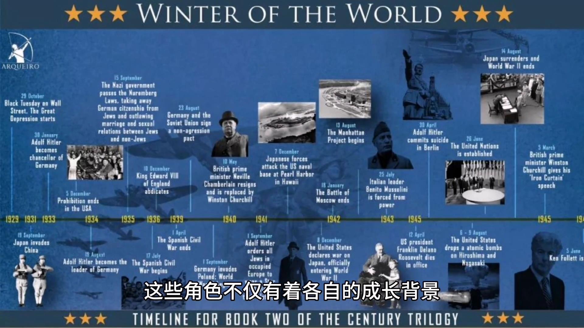 ·其次在故事情节方面,《世纪三部曲》的三个部分分别以一战、二战和冷战为背景,通过描述五大家族三代人的故事,展现了20世纪欧洲历史的各个重要时期。每个时期都有其独特的主题和事件,如一战中的十月革命希特勒上台,二战中的原子弹爆炸东西德分裂,以及冷战中的柏林墙倒塌肯尼迪遇刺等。这些历史事件不仅为故事增添了戏剧性,也让读者对历史有了更深入的了解。