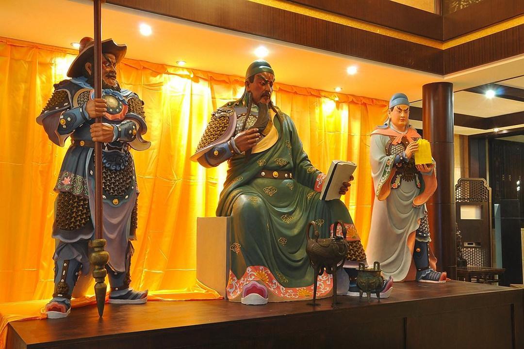 在关羽偏殿中,有二米高的泥塑贴金关羽塑象,头戴缀有冕旒的天平冠,正襟危坐,凝目沉思,神态端庄。在关羽趵东、西两侧,关平,赵累,周仓、关兴四人,肃然侍立。偏殿大门上悬有“义薄云天”额,是对关羽一生忠义的最高褒奖。
