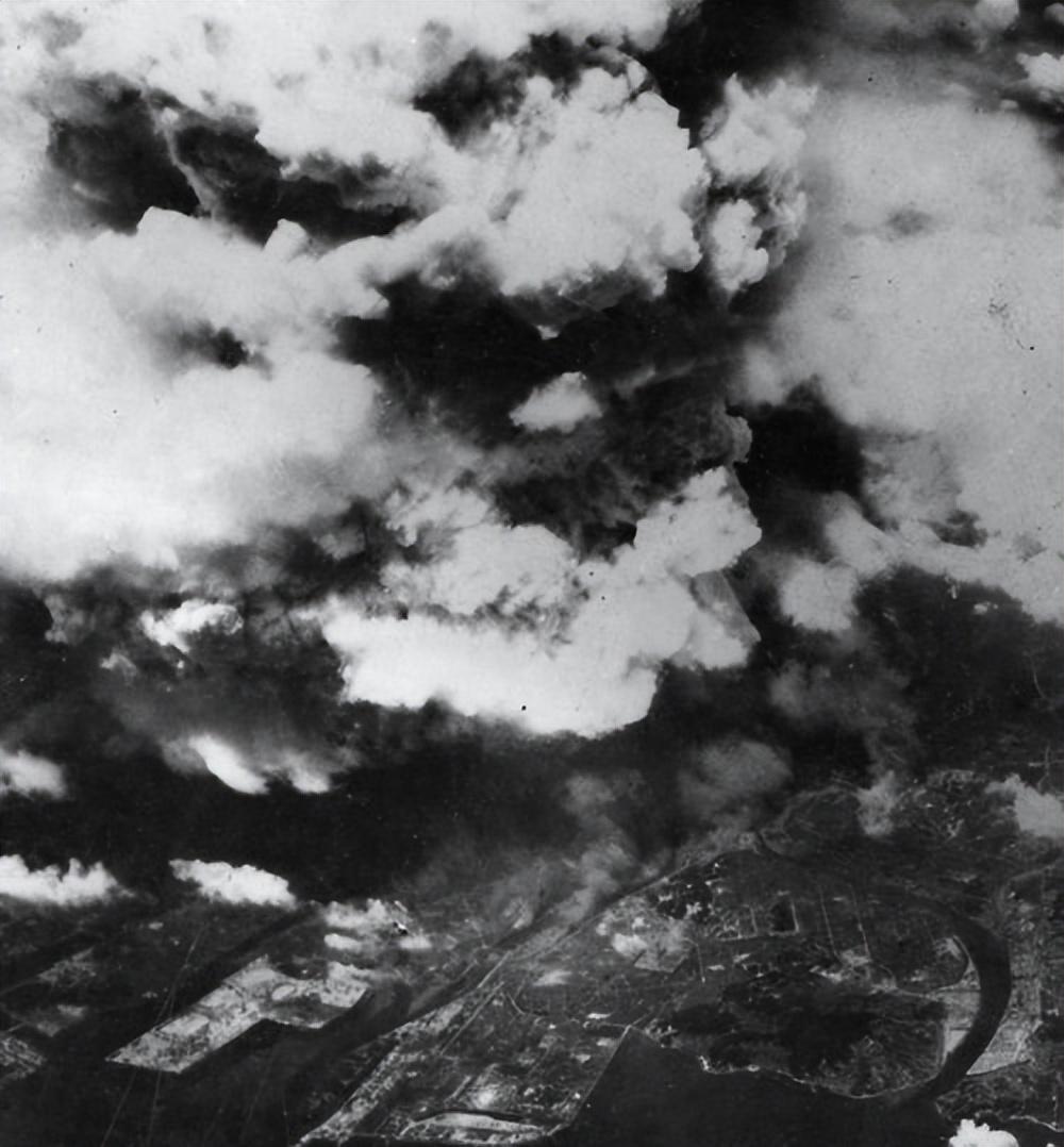 核爆的蘑菇云,中心温度3980℃,爆炸当量相当于15万吨TNT,蘑菇云腾起20000英尺高,广岛成为人间地狱