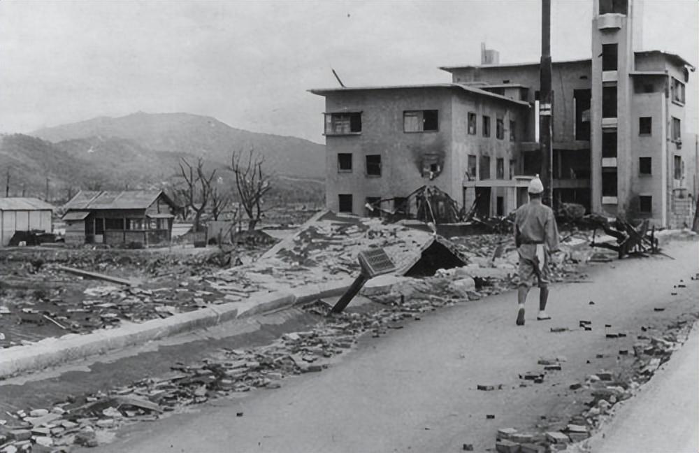 1945年9月,一个士兵走过核爆废墟 美国海军图