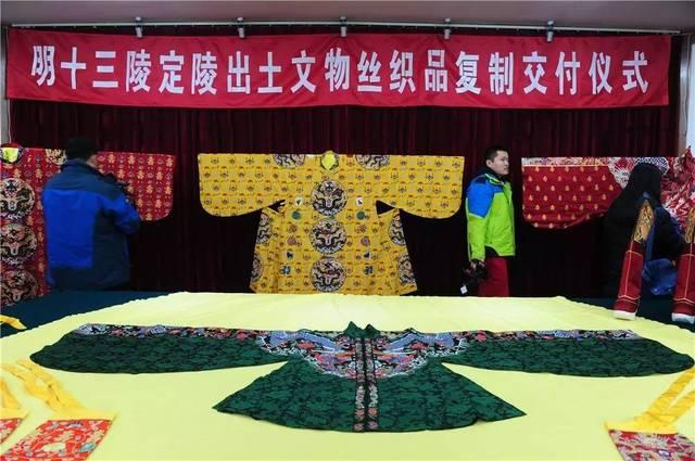 定陵共出土了3253件金器、银器、玉器、瓷器、丝织品等文物,光各种袍料、匹料和服饰用品就多达600多件,其中尤以万历皇帝身穿的缂丝十二章衮服龙袍和皇后的罗地洒线绣百子衣最为珍贵。