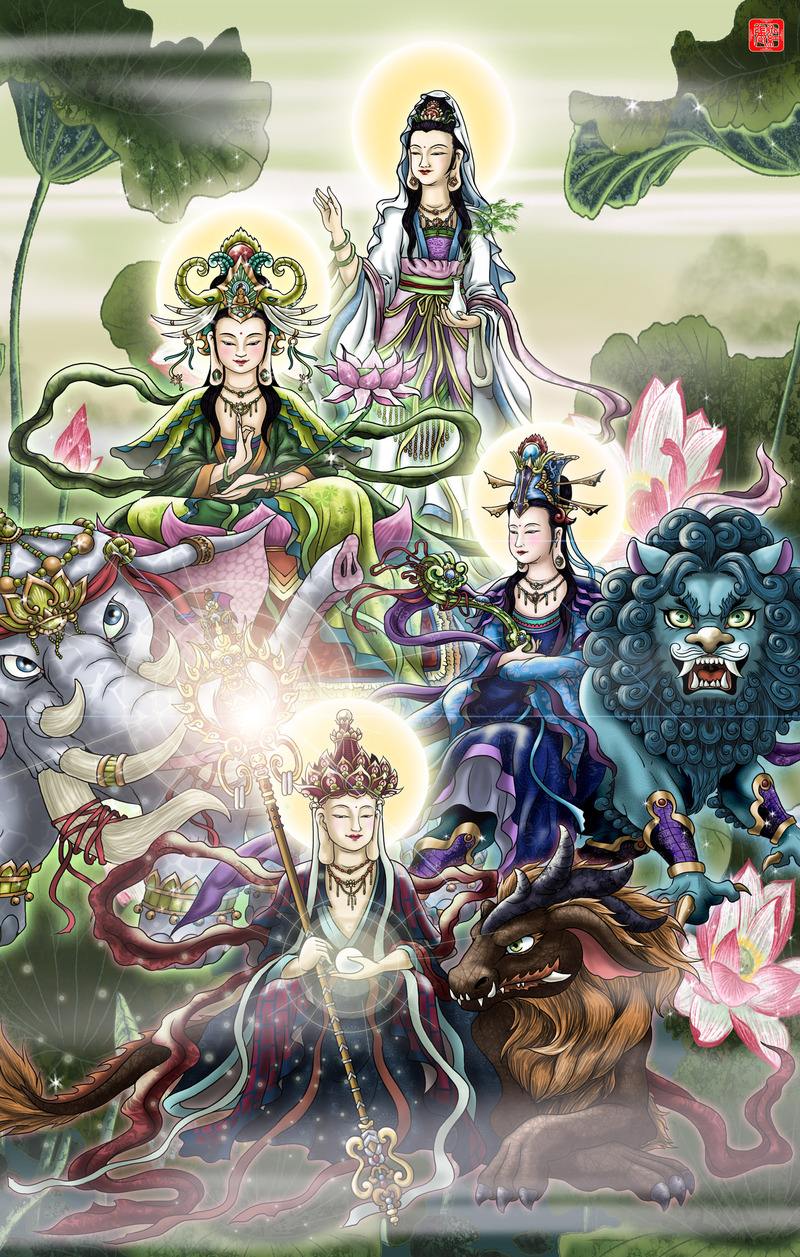 西游世界里的四大菩萨,分别是代表大智的文殊菩萨,代表大行的普贤菩萨,代表大悲的观音菩萨和代表大愿的地藏王菩萨。