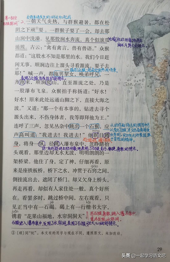 “碣上有一行楷书大字,镌着‘花果山福地,水帘洞洞天。’”石猴进入瀑布泉,发现水帘洞,表现了石猴胆大心细的特点。