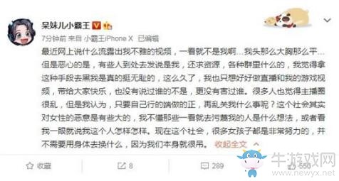 最近网上说什么流露出我不雅的视频,一看就不是我啊…我头那么大胸那么平…但是恶心的是,有些人到处去发说是我,还求资源,各种群里什么的,我觉得拿这种手段去黑我是真的挺无耻的,这么久了,我也只想好好做直播和我的游戏视频,带给大家快乐,也没有说过谁的不是,更没有害过谁。很多人也觉得主播圈很乱,但是我认为,只要自己行的端做的正,再乱关我什么事呢?这个社会其实对女性的恶意是有些大的,我不懂那些一看就去污蔑我的人是什么想法,或者看我一眼就说我这个人怎样怎样。现在这个社会,很多女孩子都是非常努力的,并不需要用身体去换什么,因为我们本身就很吊。