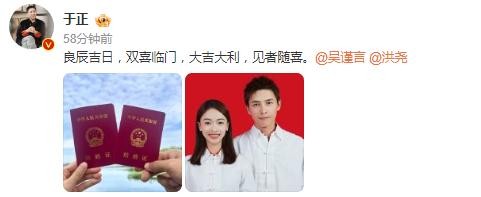 随后,老板于正也亲自下场发微博,送上了对吴谨言和洪尧的祝福。