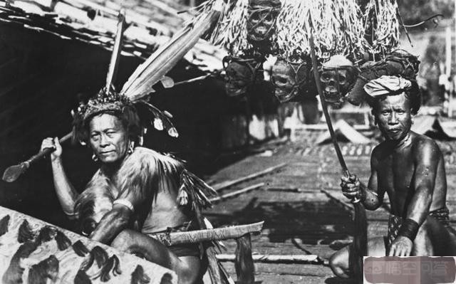 ▲老照片里的达雅人,注意后面挂着的人头骨
