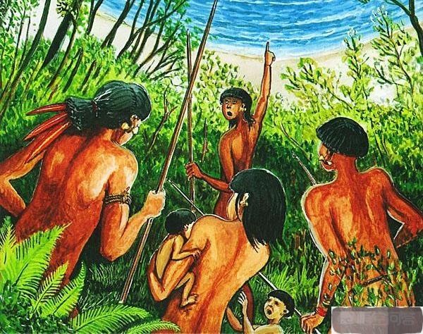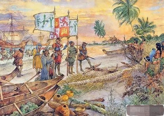当这些加勒比人看到西班牙人庞大的舰队时非常震惊,因为这超出了他们的理解能力,乃至于只顾着目瞪口呆忘记了划船。