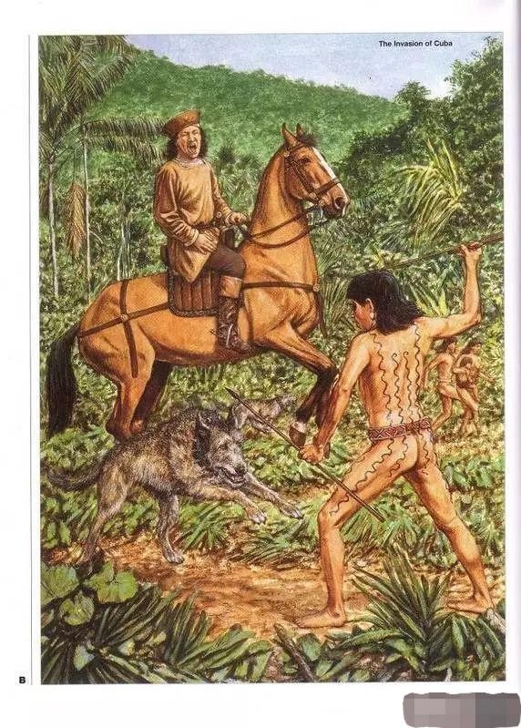 在与加勒比人的战斗中,西班牙征服者发现加勒比人对马和狗非常惧怕,尤其是受到狗的袭击后,印第安人常常吓的落荒而逃,所以美洲的西班牙军队中都养了许多大型犬以对付印第安人。有的西班牙征服者甚至认为在对抗印第安人时,一条狗抵得上10个战士。