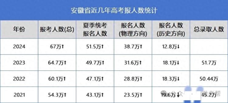2024年是安徽省高考综合改革落地首考之年。据预估,今年安徽高考报名人数67万,除去高职单招已录取考生15.5万,6月统考实际考生人数51.5万。其中历史组12.8万,物理组38.7万。从数据来看,物理组的人数大量增加,历史组的人数大量减少。2024年安徽新高考物理组约是历史组人数的3倍,竞争甚是激烈呀!