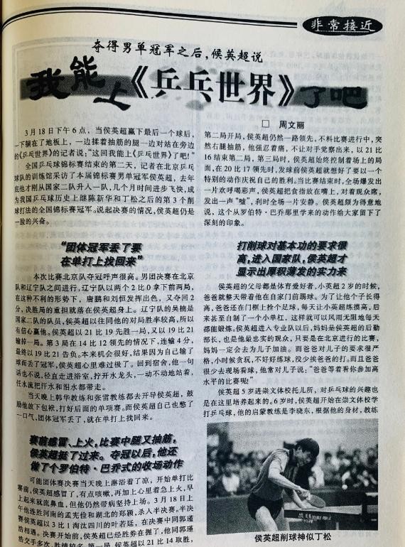 他从资格赛打起,连克张煜东、卫冕冠军梁靖崑等强将进军决赛,2019年7月29日,阔别19年他又一次站在了全锦赛决赛的赛场,他的对手是2000年5月出生的王楚钦,也就是说当侯英超第一次站在这里的时候王楚钦还是个婴儿。