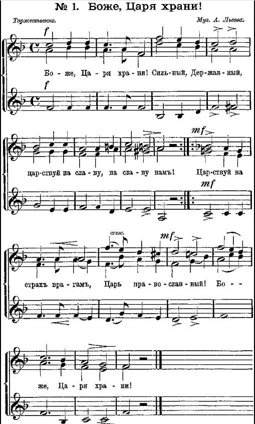 1816年俄国在打败拿破仑的法兰西第一帝国之后,沙皇亚历山大一世建议为俄罗斯帝国正式谱写一首国歌做为胜利的纪念。因为时间紧、任务重,下面的人直接袭用英国国歌《天佑吾王》的曲调,只是歌词由瓦西里·茹可夫斯基撰写,做为俄罗斯帝国从1816年至1833年之间的国歌,歌名为《俄罗斯人的祈祷》(俄语:Молитва русских, Molitva russkikh)。