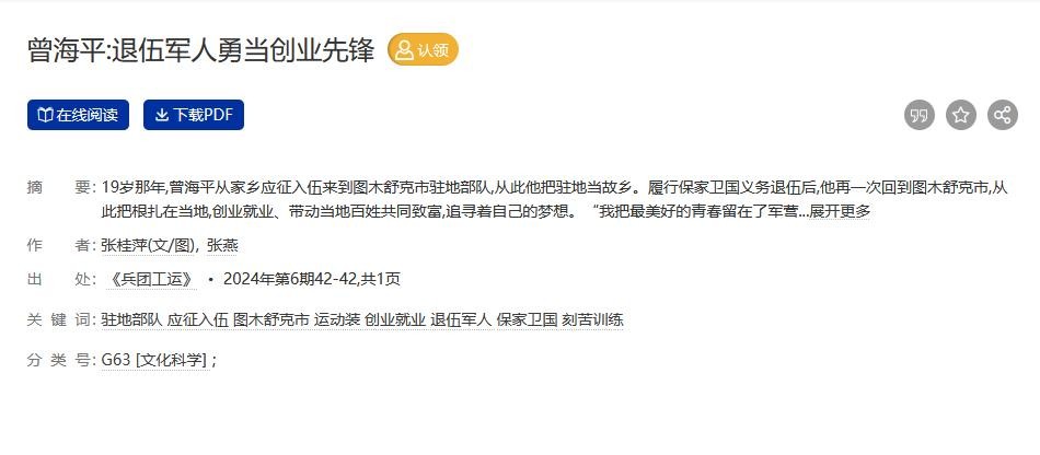参考资料:[1]张桂萍(文/图),张燕.曾海平:退伍军人勇当创业先锋[J].兵团工运,2024(6):42-42