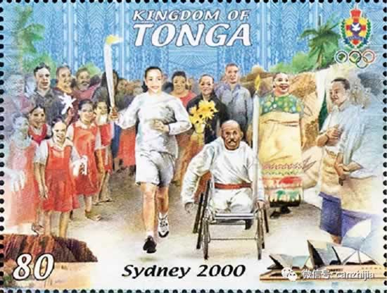 2000年悉尼残奥会纪念邮票中汤加王国选手用竞技轮椅参加比赛的场景。