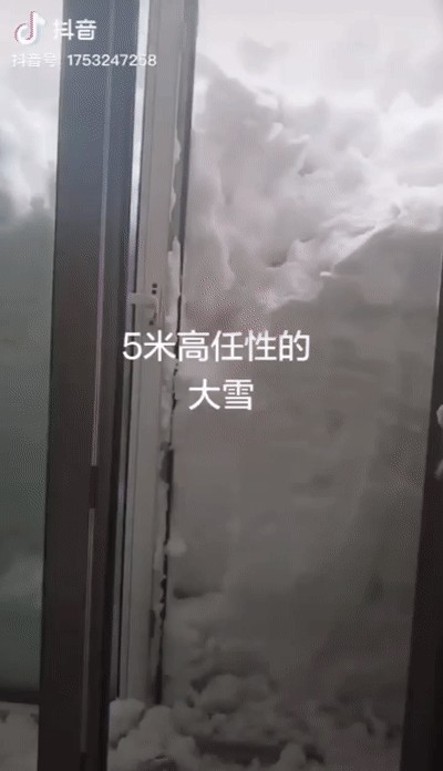 自家门被积雪堵住,只能翻窗爬出。