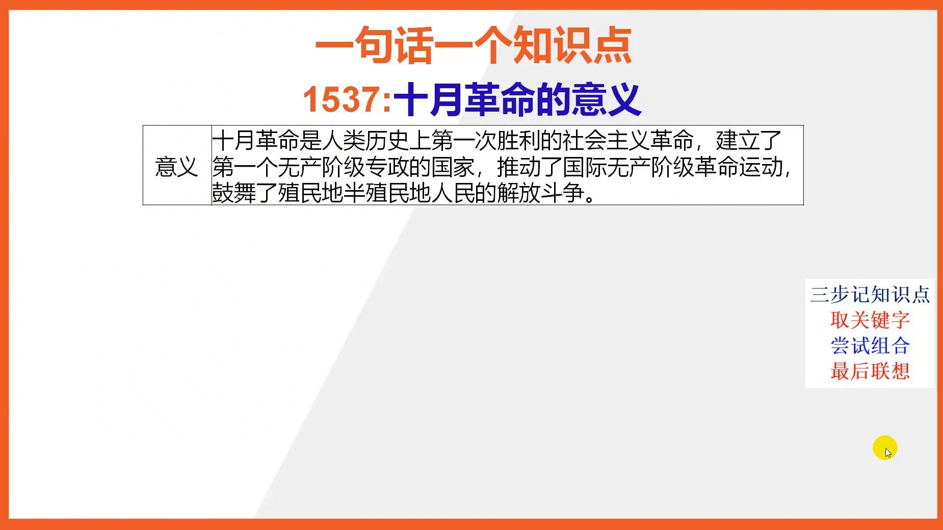 2. 大家好,继续分享我的一句话一个知识点,现在变成十月革命的意义。之前分享了二月革命、十月革命,二月革命是国人一起上,一起七年三月,七月革命是 1917 年 11 月 6 日和 7 日拿着筷子和锄头取得了胜利。