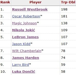 凭借此次三双,詹姆斯的三双总数来到108次,超越基德(107),独居历史第五。排在他前面的是约基奇(109)。