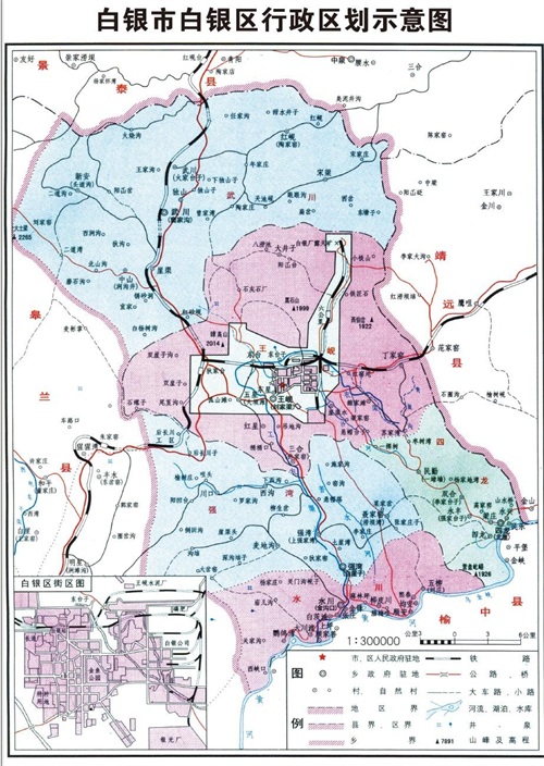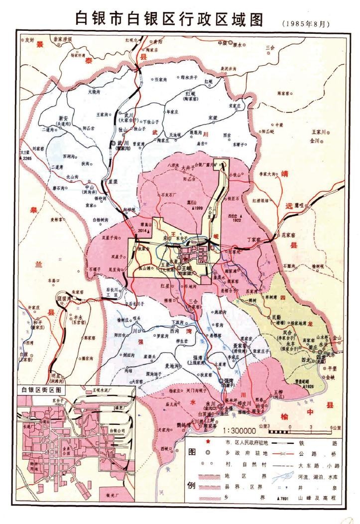 1995年底,白银区行政区域包括人民路、公园路、四龙路、工农路街道及四龙、水川、强湾、王岘、武川乡。街道共设55个居民委员会、85个家属委员会,乡共设41个行政村217个社。