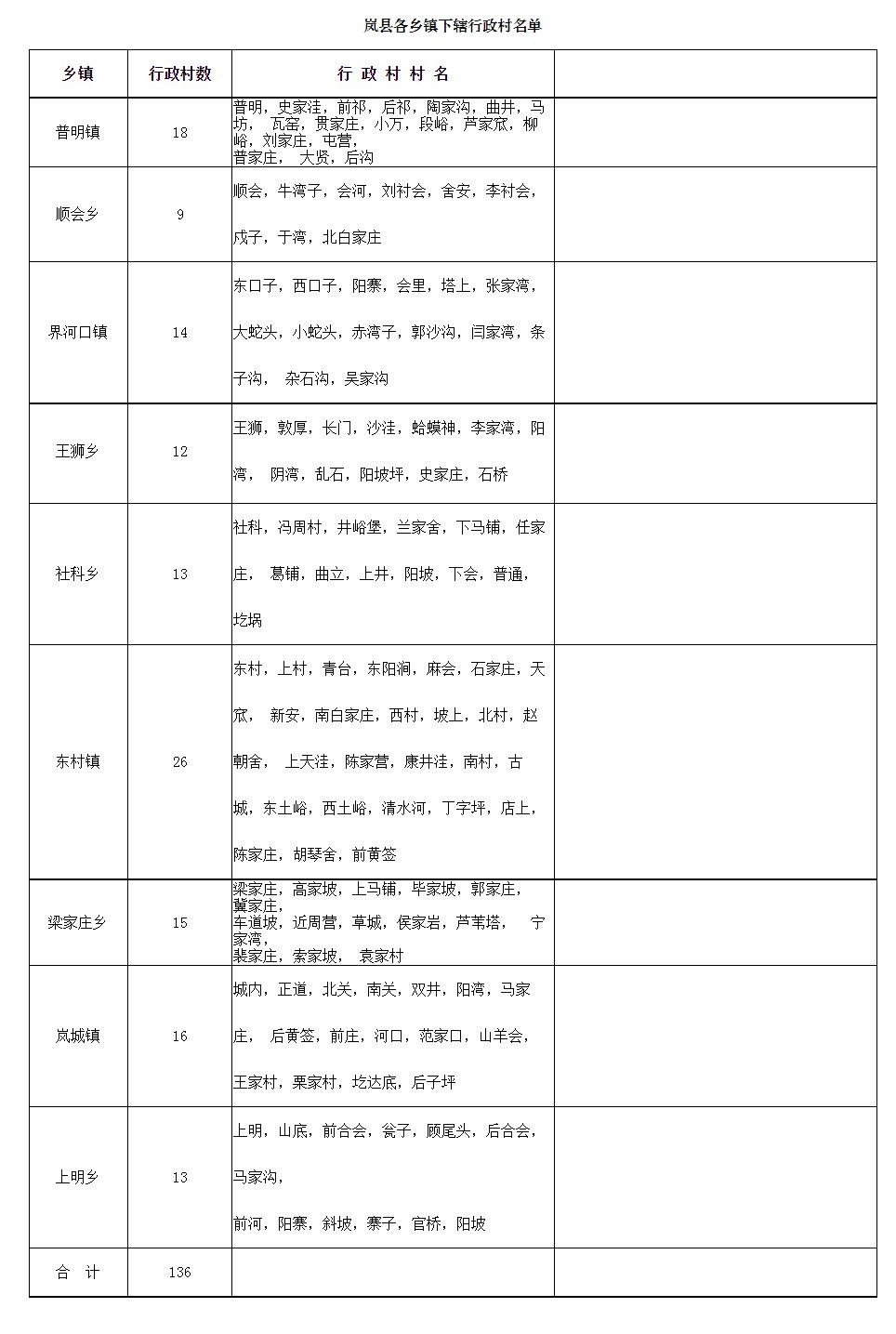 1956年3月,撤区,划全县为东村镇和普明、合会、上明、东土峪、岚城、梁衬会、上井、兰家舍、袁家村、王狮、敦厚、榆湾、河口、张家湾、赤湾子、大蛇头、界河口、毕家坡、梁家庄19乡,共20个乡镇。