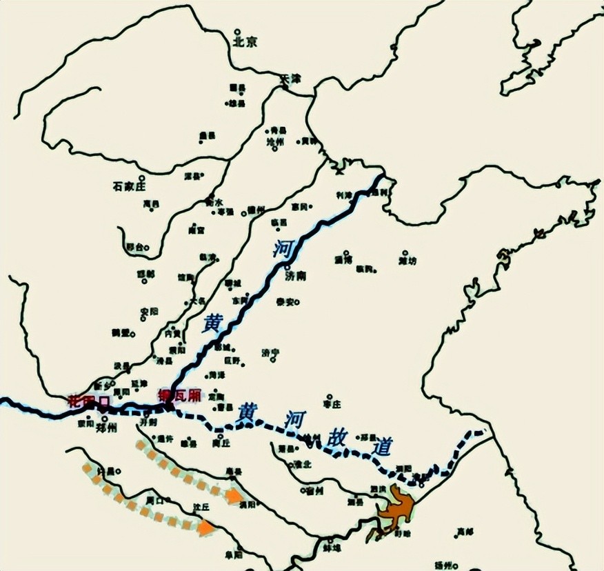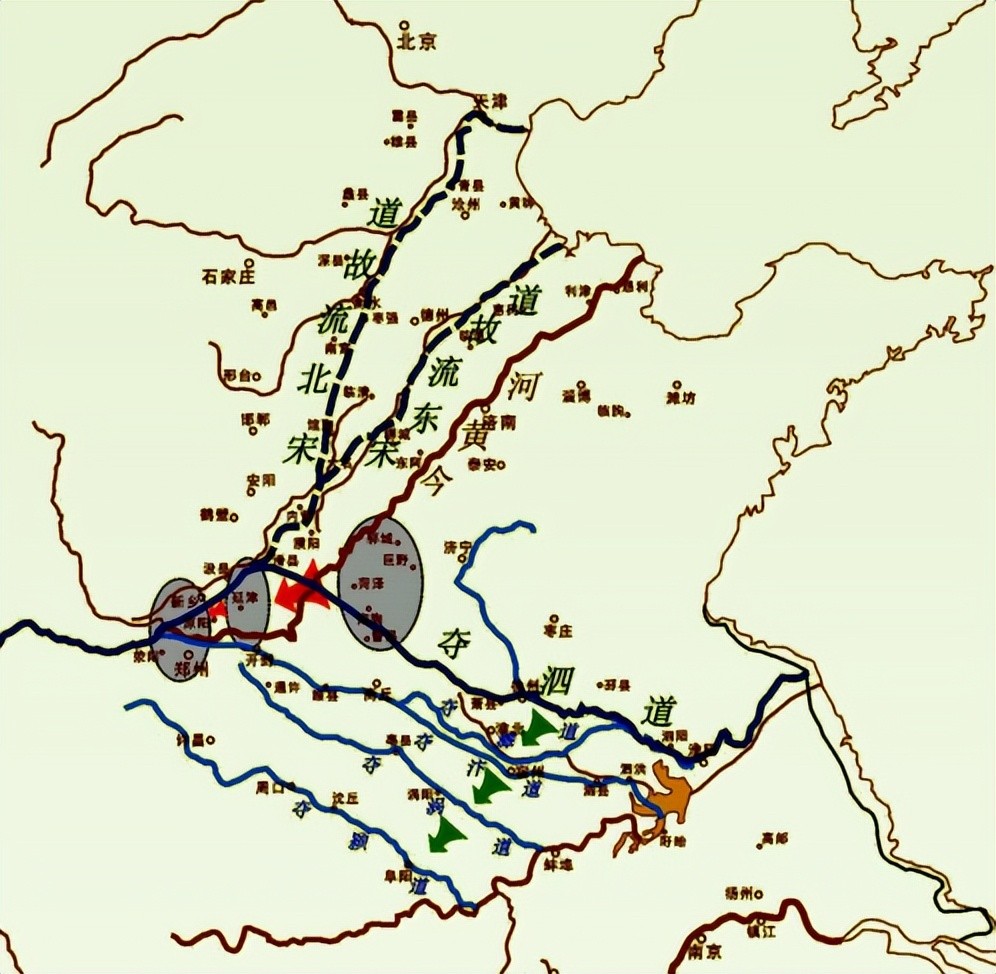 完颜宗望的金国军队南下,宋京汴梁陷落,当时的宋京留守杜充不敢交锋,在今河南滑县李固渡人为开堤,“以水当兵”,结果黄河由泗水夺淮入海,给淮河水系带来了巨大的灾难。